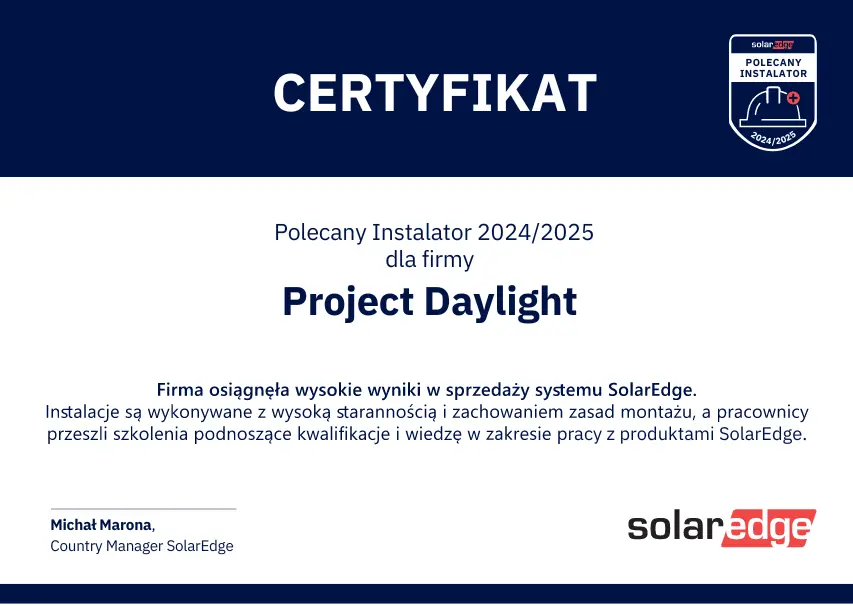 Tym dokumentem chciałbym potwierdzić fachowość i profesjonalizm firmy Project Daylight w realizacji wszelkich czynności instalacyjnych elektrowni fotowoltaicznej o mocy 5,2kW wykonanej na moim domu. Pragnę polecić każdemu wszelką pomoc i doświadczenie jakim dysponuje właściciel firmy Pan Piotr Jankowski.